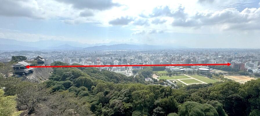 CENTAURI was used to connect Matsuyama Castle (Bagugu Yagura, ~130m above sea level) to the Ehime CATV building at the foot of the mountain, over an approximately 800m path.